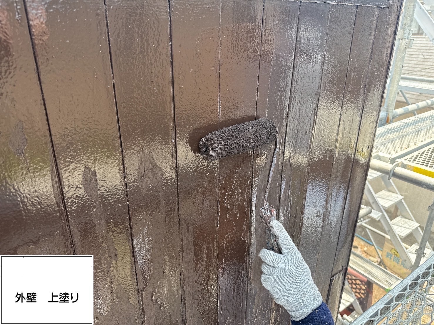 今回の外壁は、既存塗膜の状態が比較的良好だったため、下塗り → 中塗り → 上塗りの標準的な3工程で仕上げました。